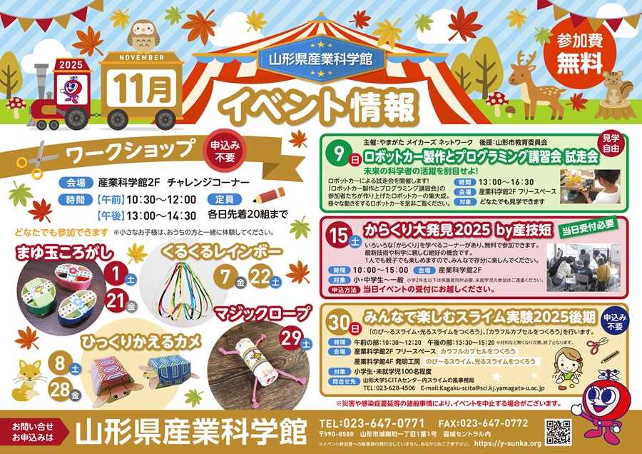 山形県産業科学館のイベント情報です。 「まゆ玉ころがし」や「ひっくりかえるカメ」等のワークショップを実施します。 また、「からくり大発見2025 by産技短」※を開催いたします。 どなたでも楽しめますので、ぜひお誘いあわせのうえ、ご来場ください! ※当日受付が必要なイベントになります。 山形県産業科学館