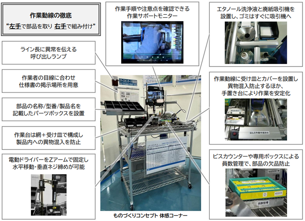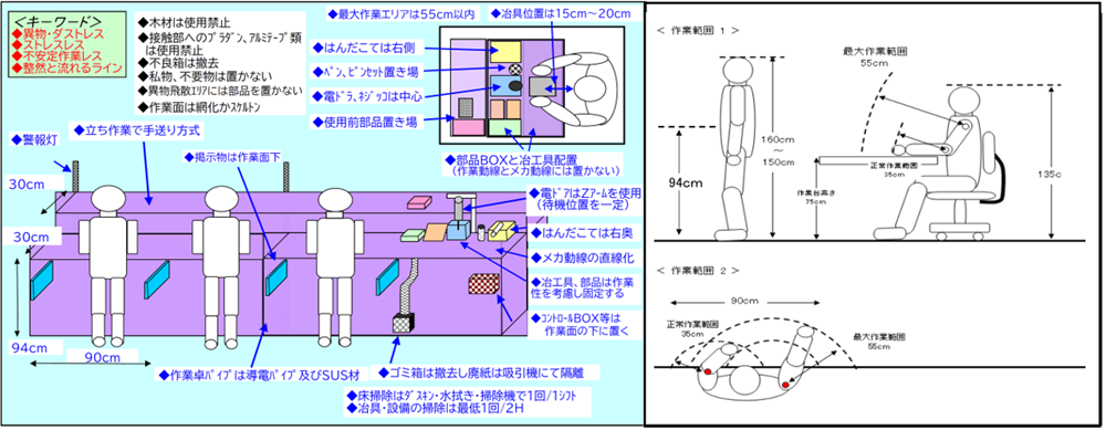 「ものづくりの標準化」は4つのキーワード(ダストレス・ストレスレス・不安定作業レス・整然と流れるライン)を盛り込んだ「ものづくりスタンダード」を策定し、部品と工具の配置の最適化など100項目の条件を定義しています。その条件を満たすように作業環境や作業動線の改善を積み重ねることで、ストレスや不安定な要素を排除し、人と製品に快適な製造環境を目指しています。