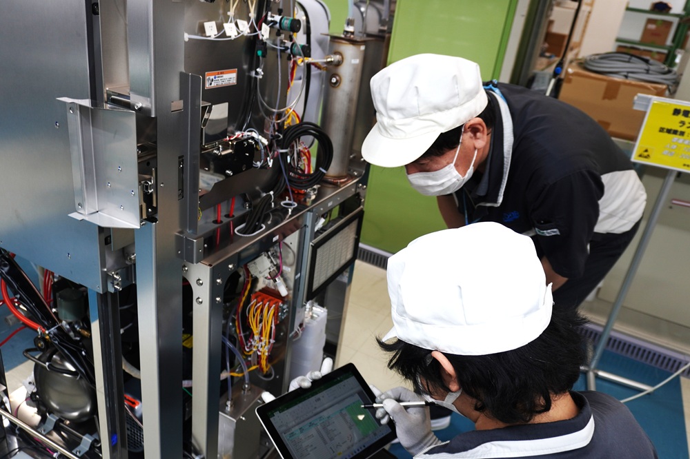 大型装置の生産は数千点の部品を組み合わせる工程のため、一般的には経験と高い専門性が求められます。そこで私たちは3Dアニメーションを使った作業仕様書を導入し、経験が少ない方でも専門的な作業ができるような取り組みも行っています。また、2名チームを構成し、複数台を平行生産しながらタブレット端末を使って組立状況を相互にチェックする方法を標準化しています。